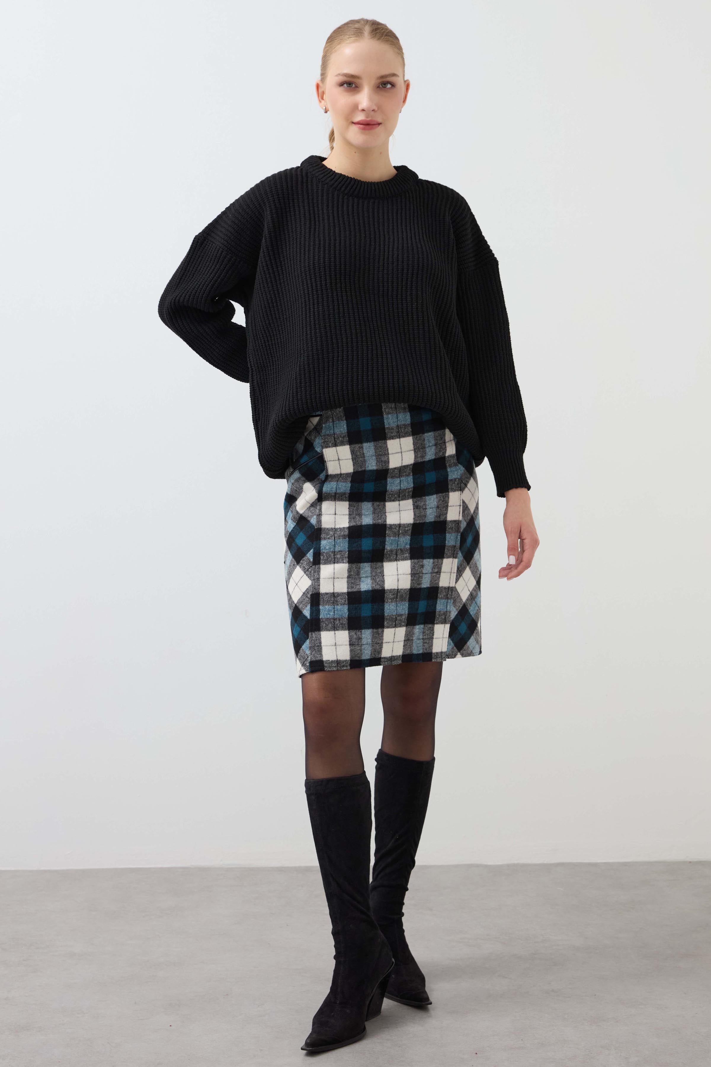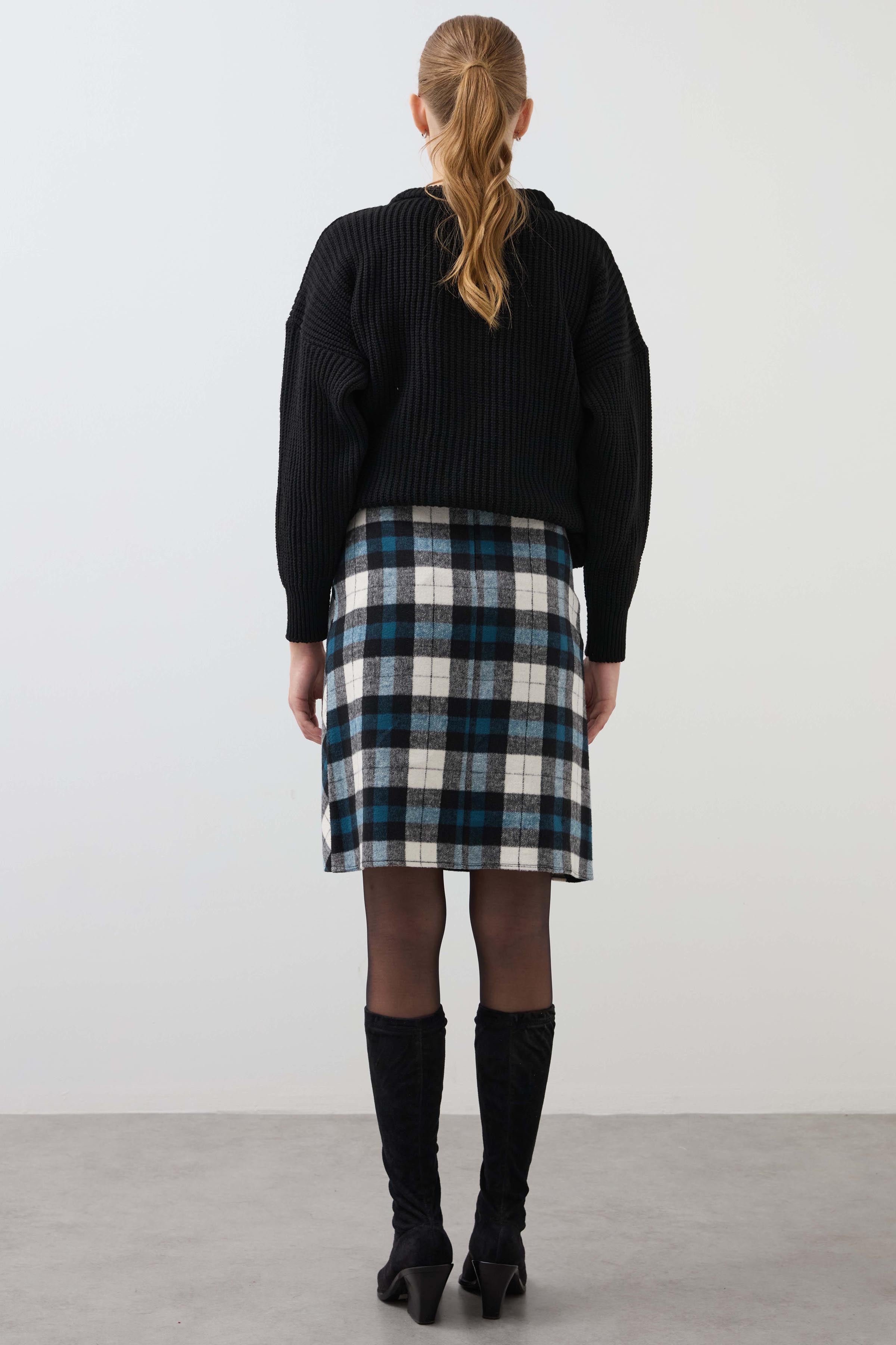 Plaid Leather Skirt - Blue