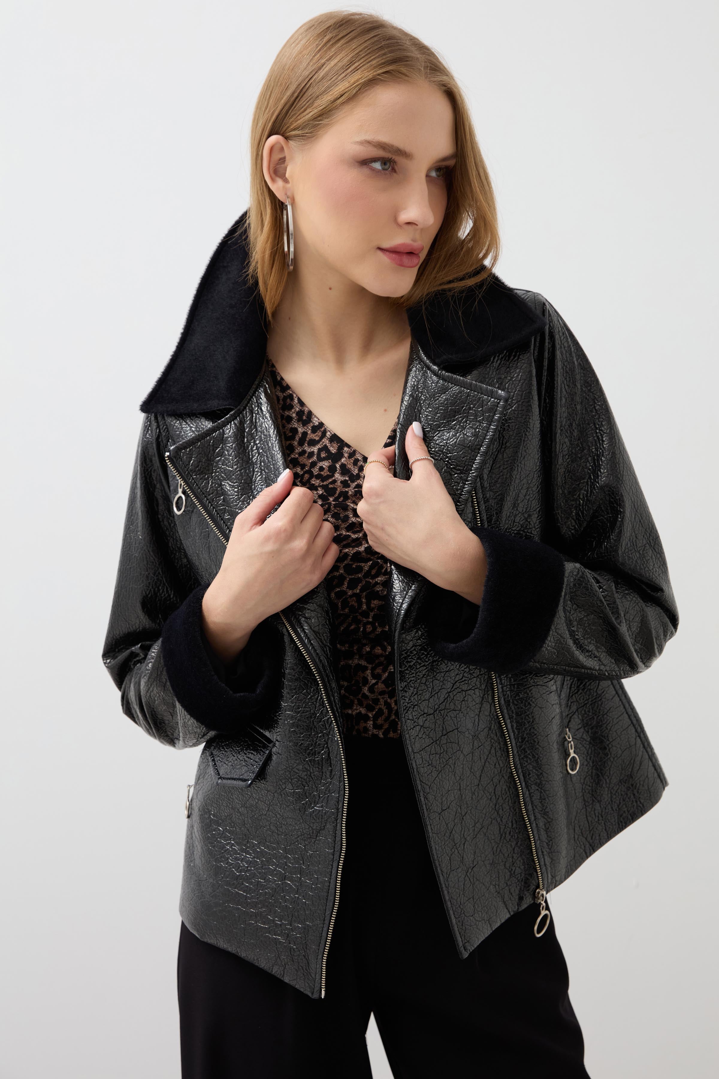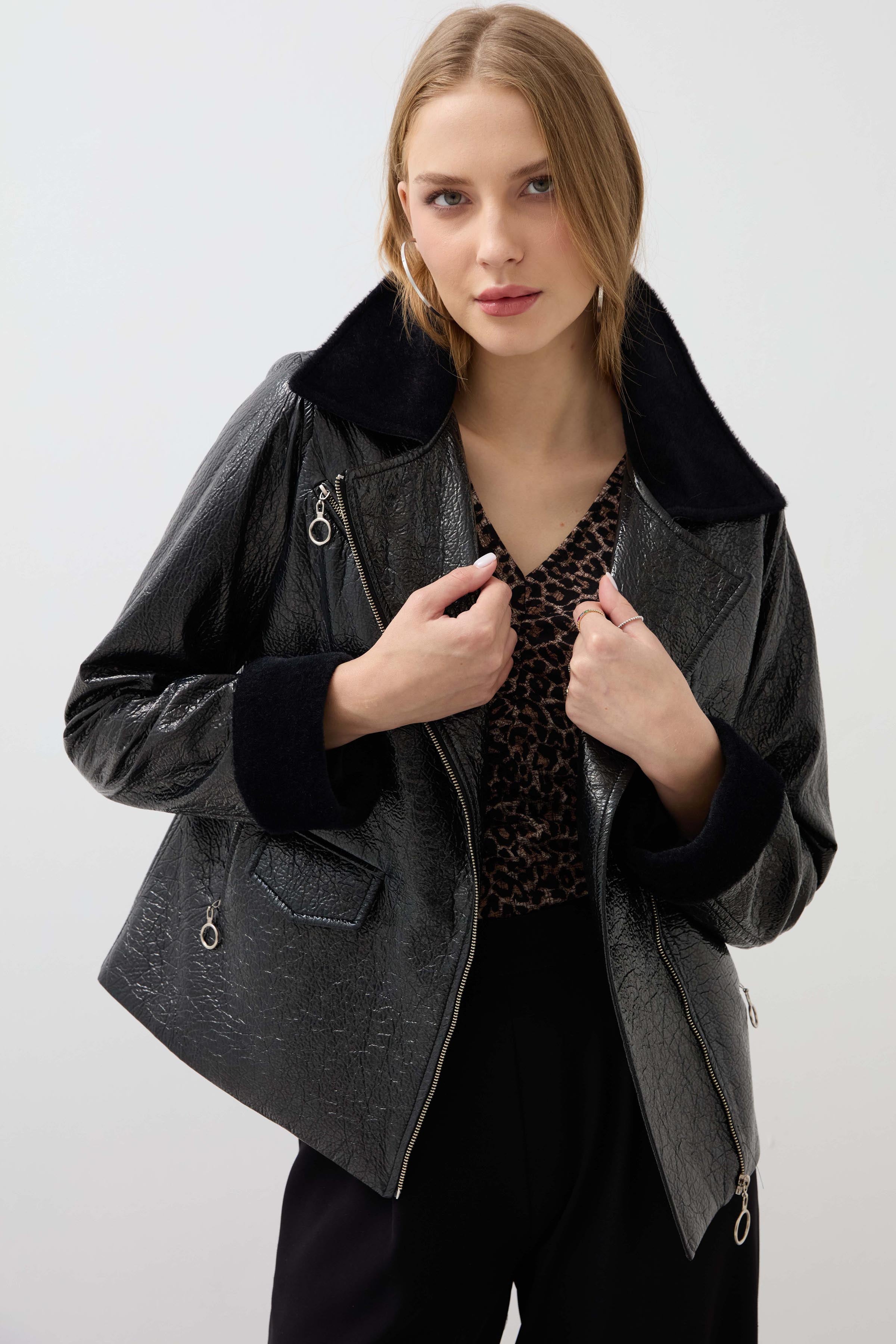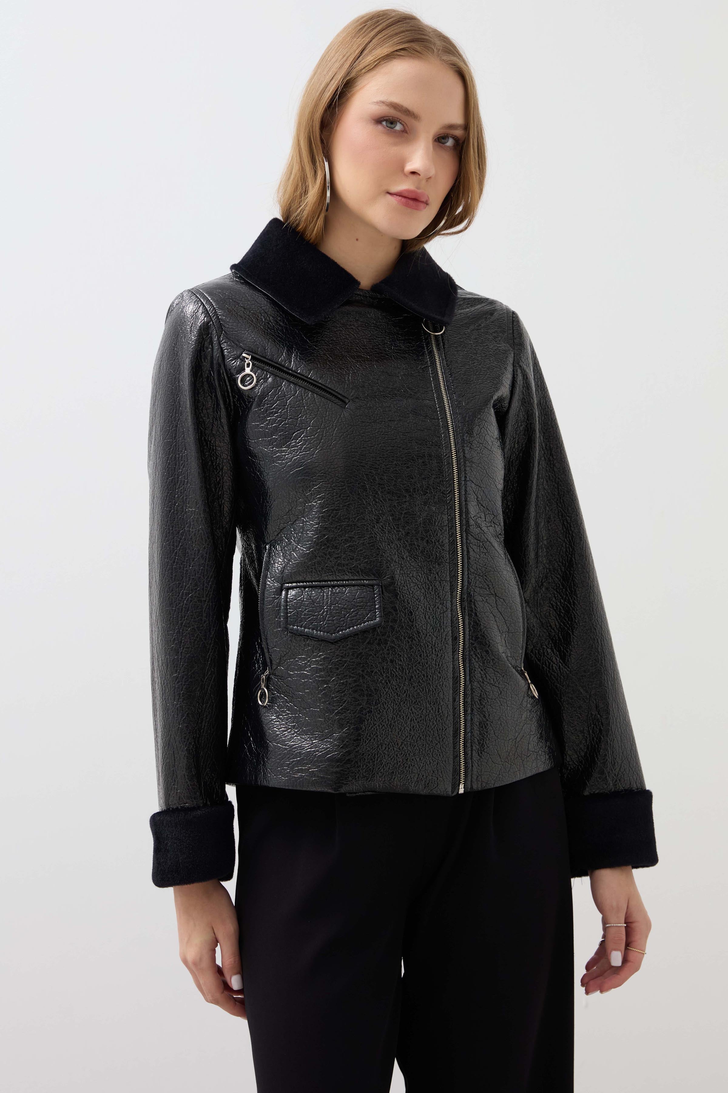 Fur Collar Patent Leather Coat - Black