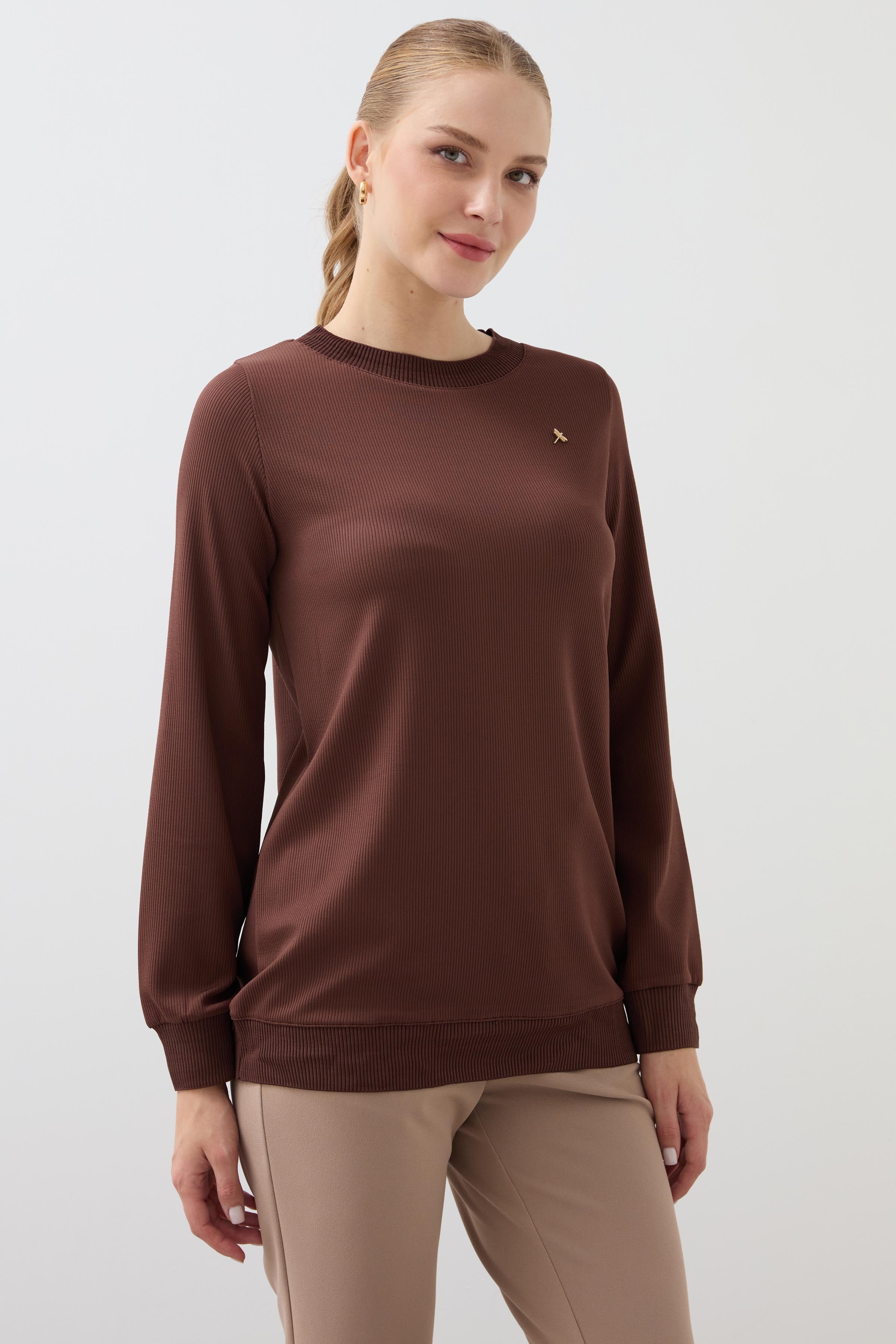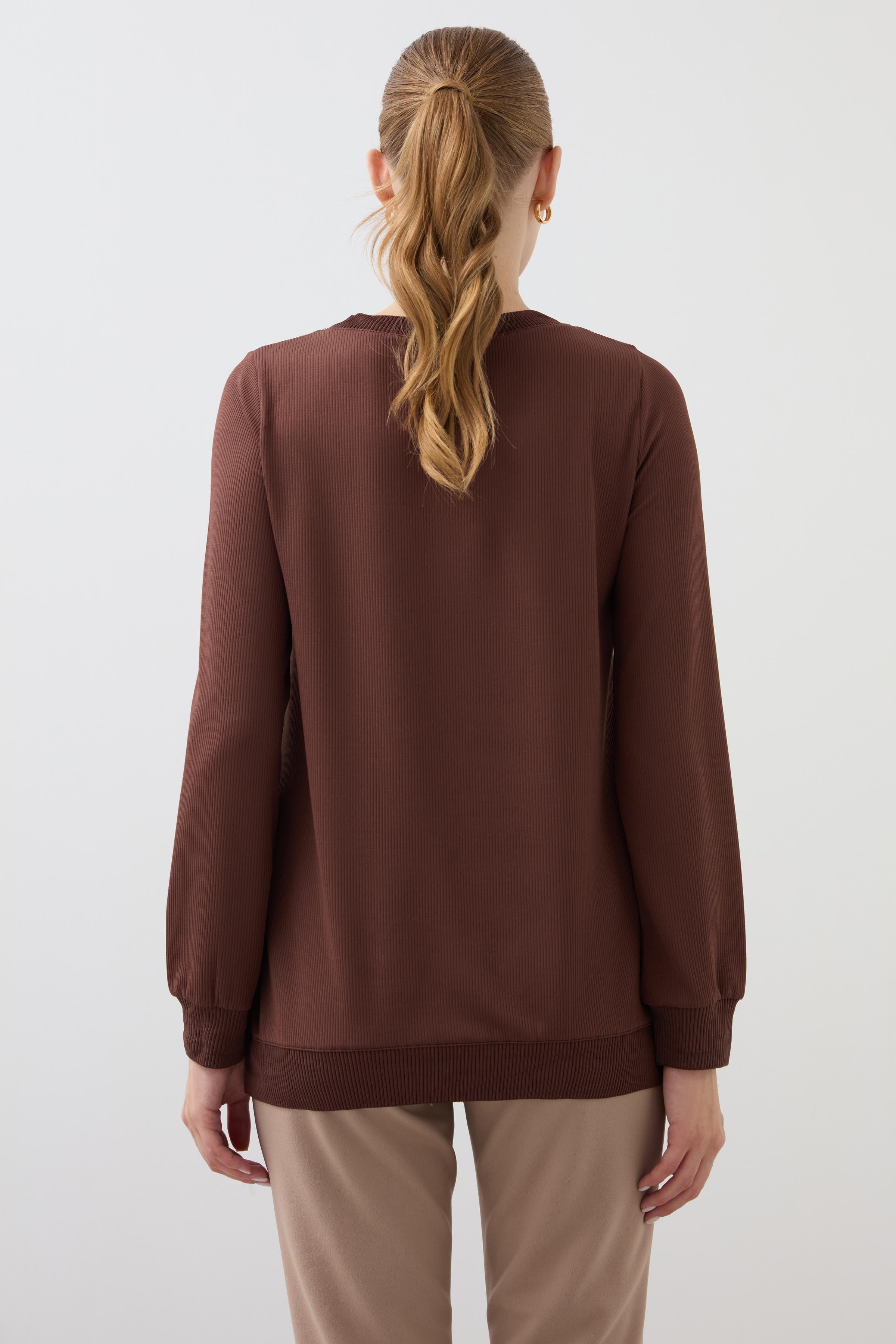 Crew Neck Long Sleeve Blouse - Brown