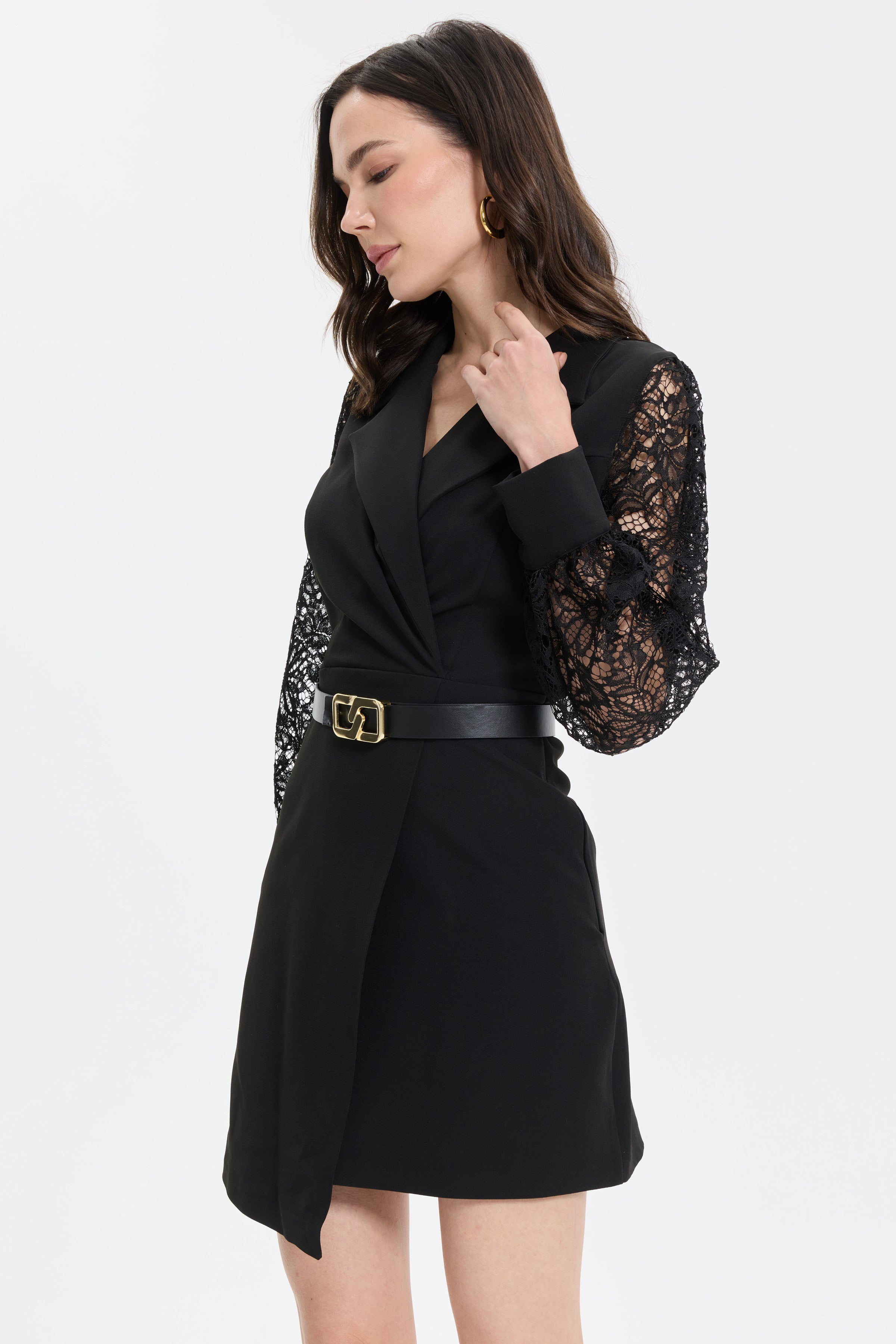 Siyah Dantel Kol Blazer Yaka Elbise - Siyah